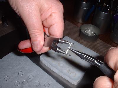 Each link is stretched in a pair of round-nosed pliers. The oval thus formed is crimped in the center with a second pair of pliers.